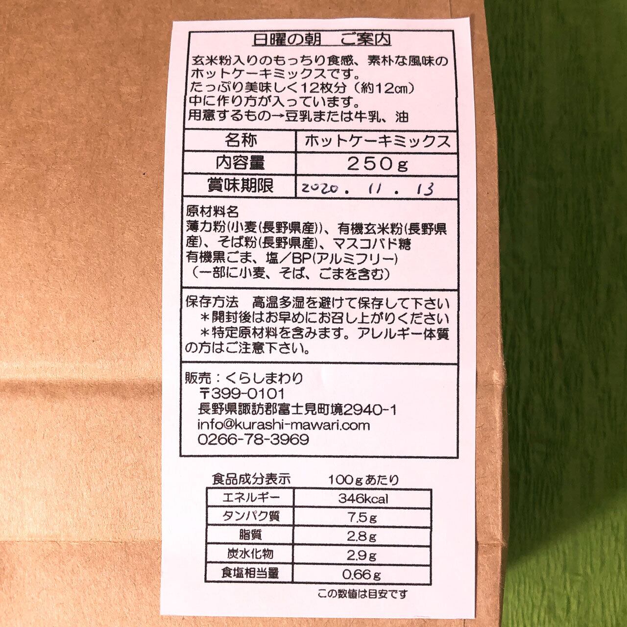 信州産の小麦粉と、有機玄米粉、そば粉を黄金比で調合し、もちもち食感のホットケーキミックスを作りました。地元産にこだわったホットケーキミックスです。